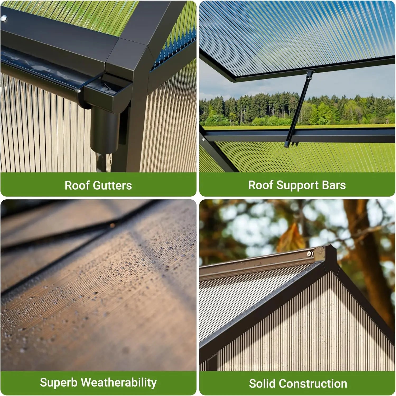 【Resistant and Sturdy】The 720g polycarbonate greenhouse features an upgraded aluminum frame for structural stability to withstand storms. It offers protection during a year-long cultivation of plants.